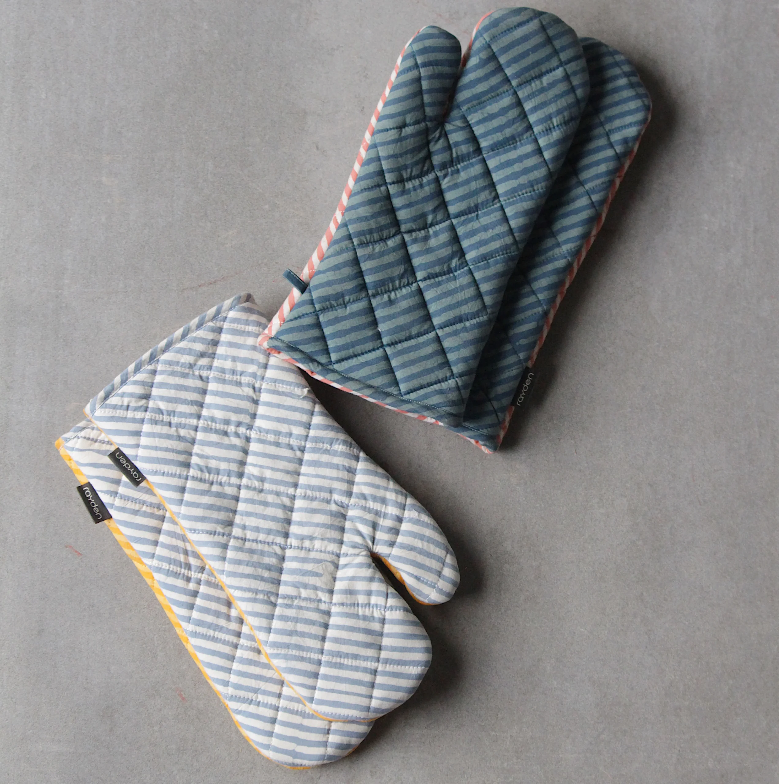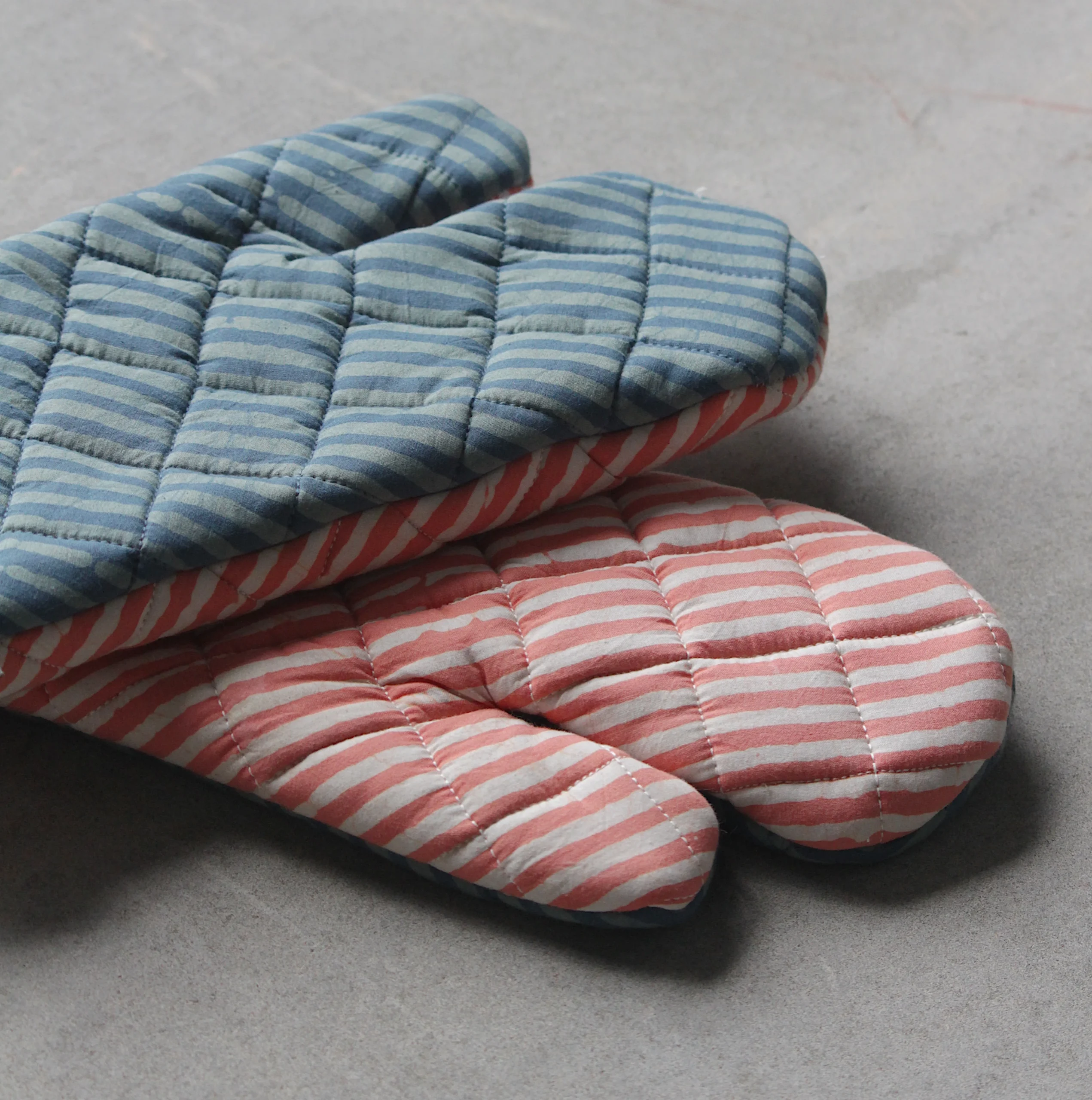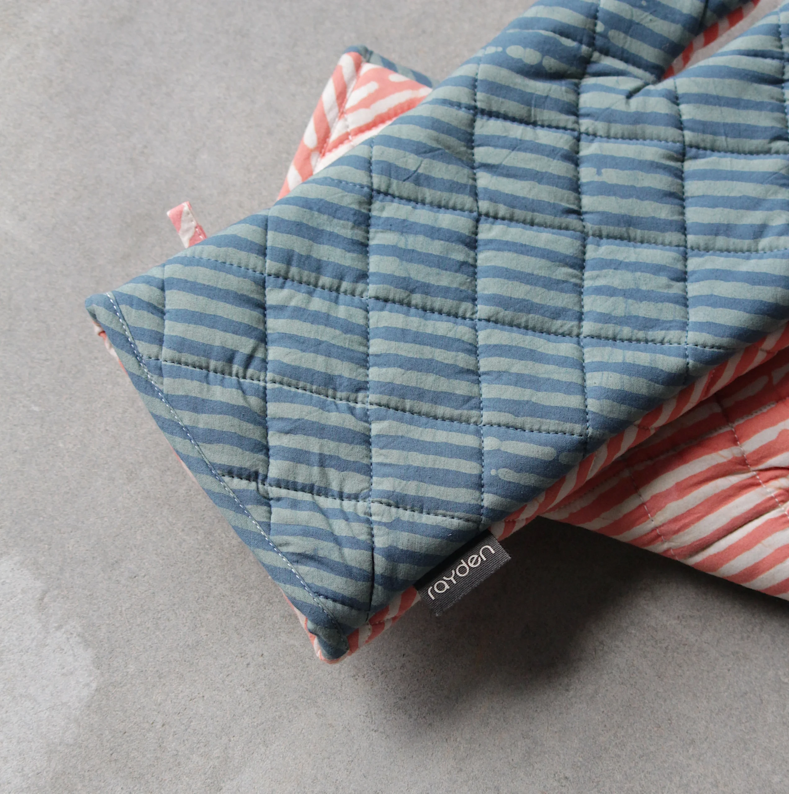 Rayden Basik Pop Oven Mittens, Dual coloured in Teal and Coral, Handblock printed in Batik on 100% Cotton