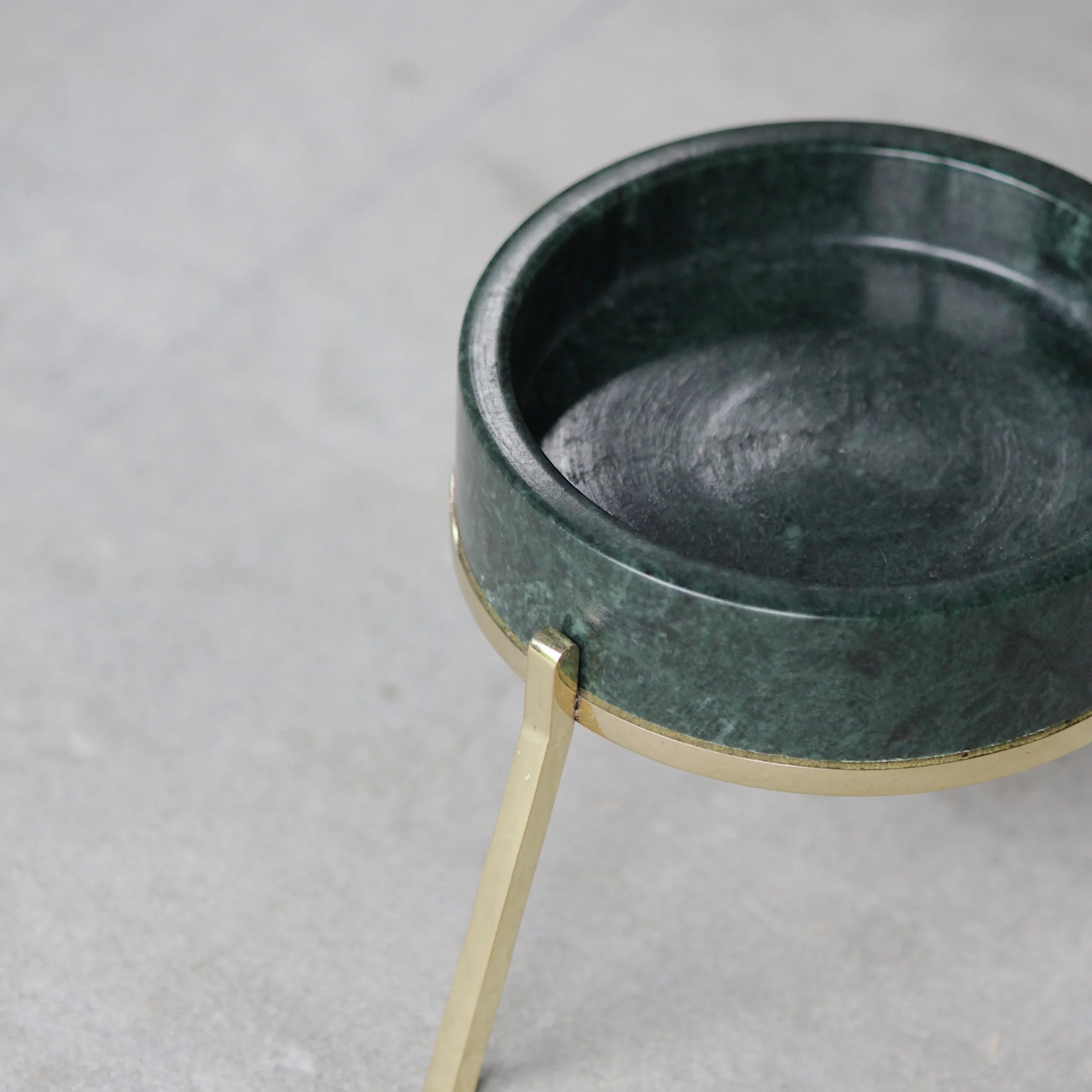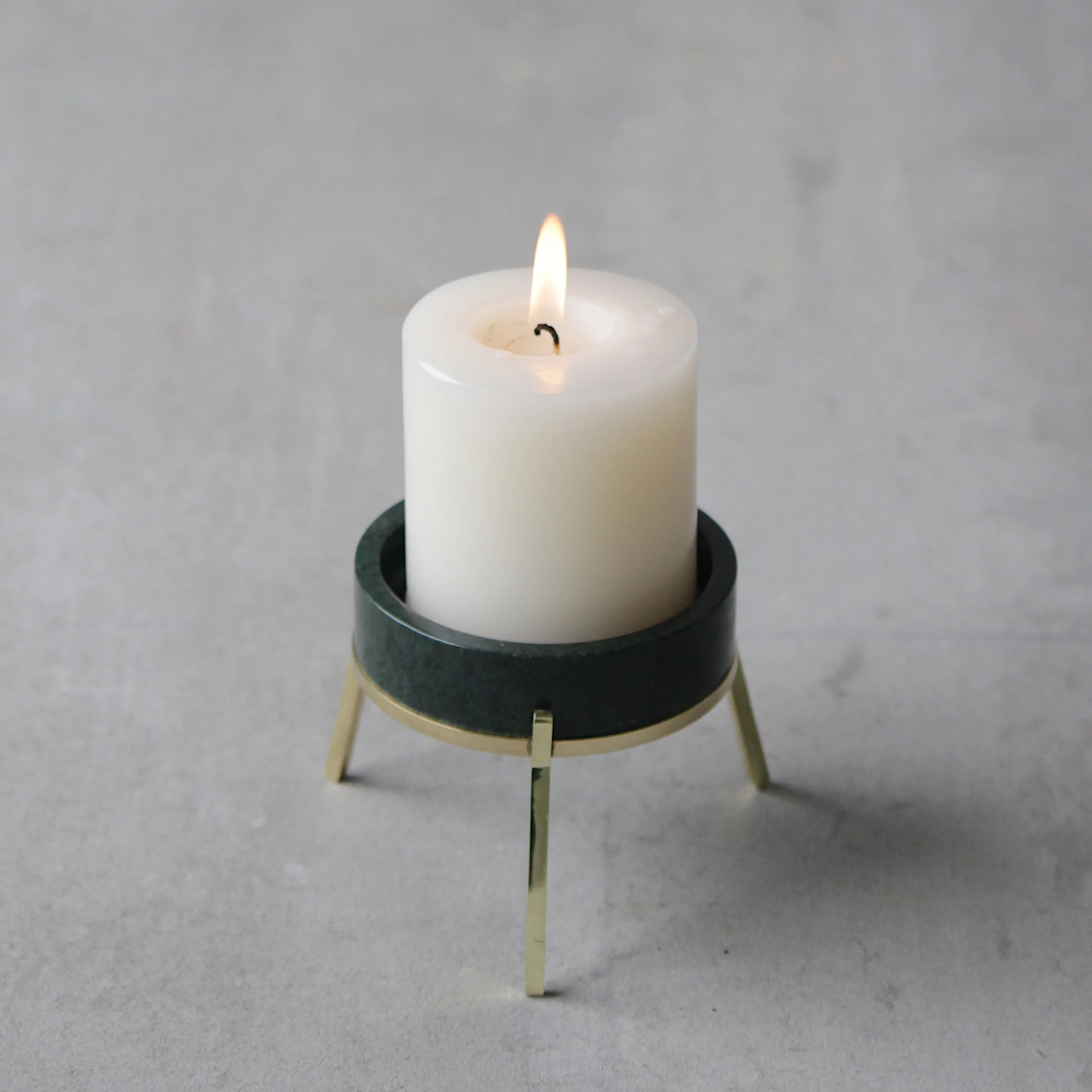 Handcrafted candle holder featuring a green marble base and brass stand. Designed to hold wide pillar candles, this piece adds a touch of elegance and warmth to any setting.