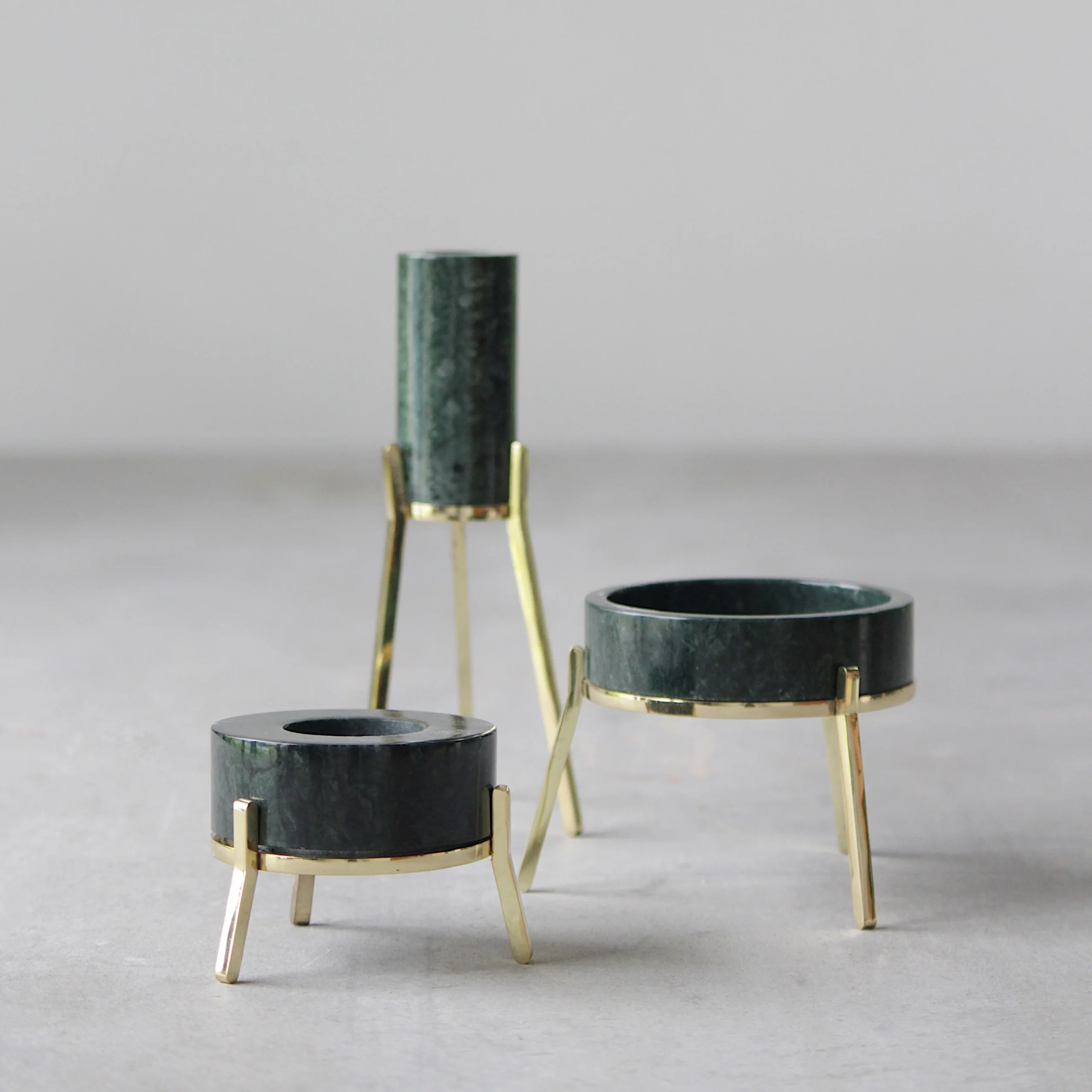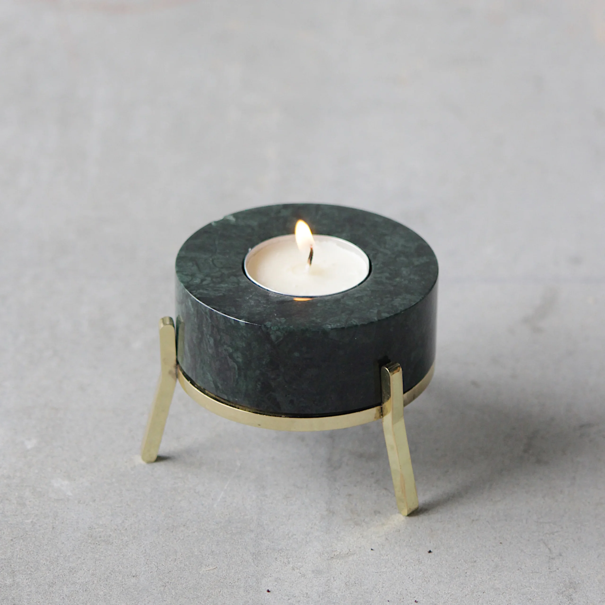 Compact tea light holder featuring a green marble base and brass stand. Designed to be used in intimate table gatherings, this piece adds a touch of elegance and warmth to any setting.