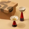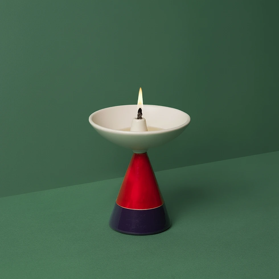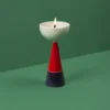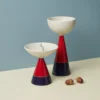 A gift set of a small and a tall oil lamp with a ceramic body and Channapatna base in colour blocks of red and blue.