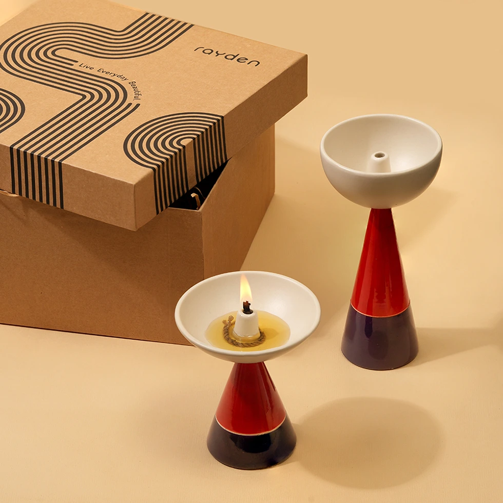 Bring charm and grace to your home with this set of oil lamps crafted in ceramic body and Channapatna wooden base. Perfect as gifting gesture, these set of oil lamps in earthy hues will transform a space into one that reflects warmth, comfort and joy! The head-turner duo are bound to spark conversations for their design and appeal!