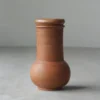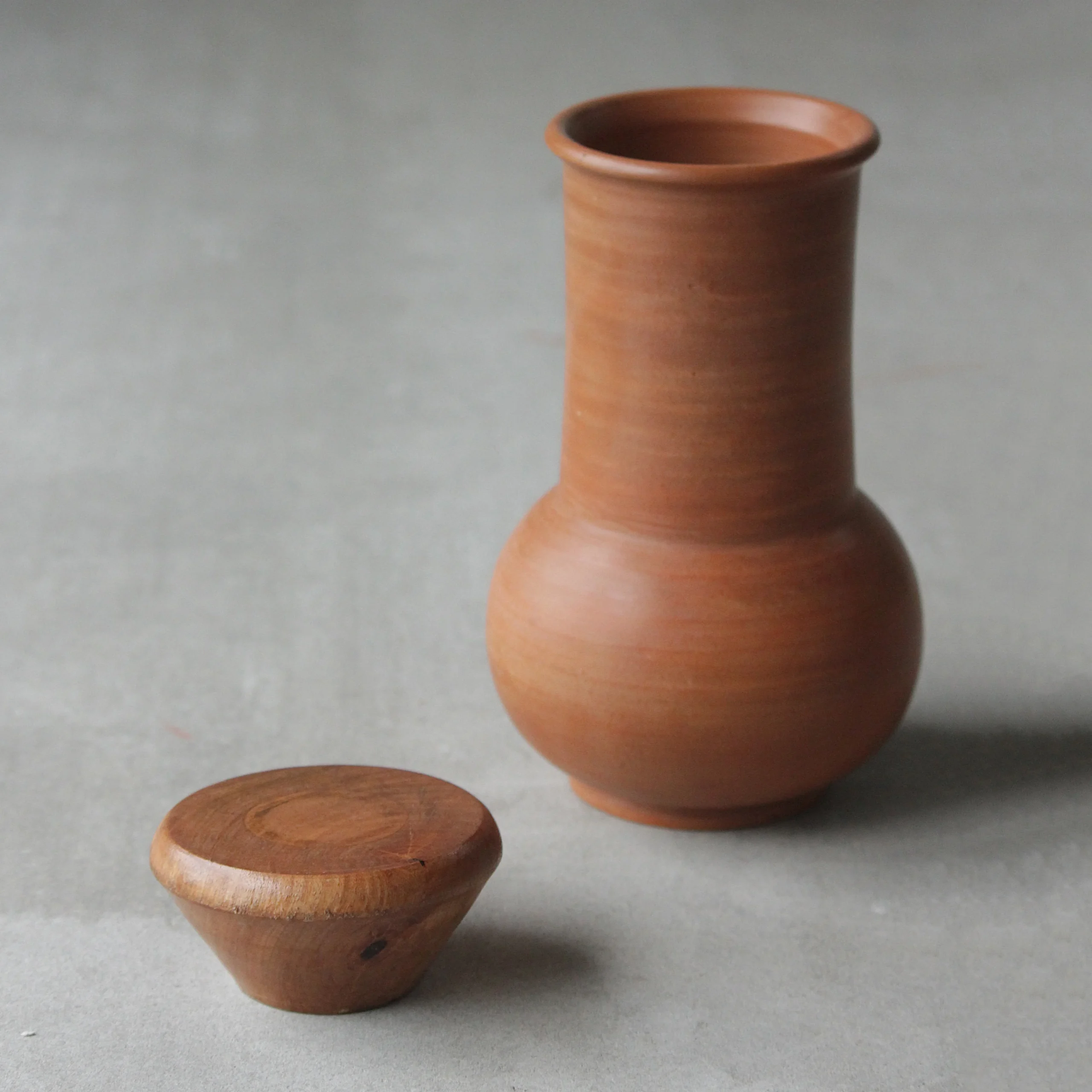 A drinkware set of carafe and two tumblers handcrafted by skilled artisans in Terracotta. The sustainable design allows for natural cooling properties while enhancing the taste of water. Ideal for bedside or dining use, this set combines traditional craftsmanship with modern aesthetics.