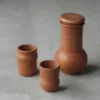 A drinkware set of carafe and two tumblers handcrafted by skilled artisans in Terracotta. The sustainable design allows for natural cooling properties while enhancing the taste of water. Ideal for bedside or dining use, this set combines traditional craftsmanship with modern aesthetics.