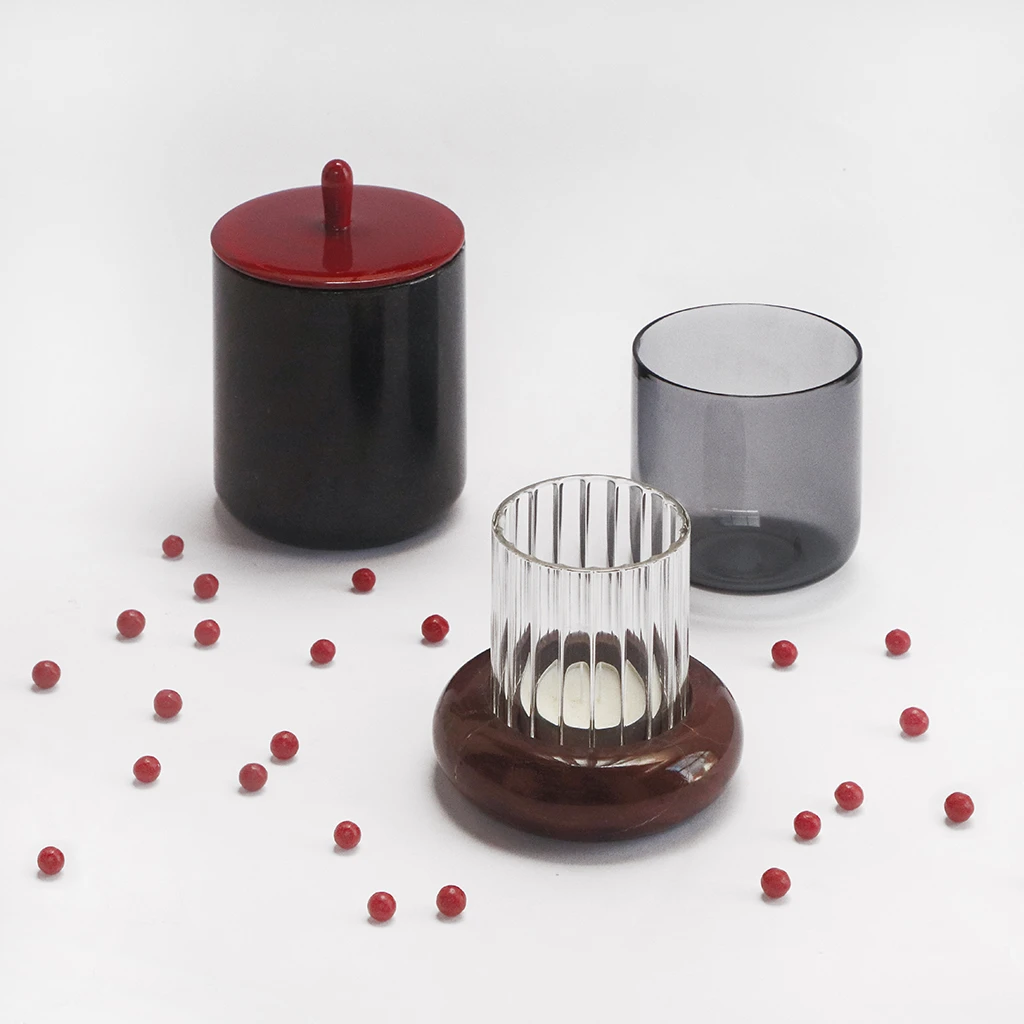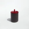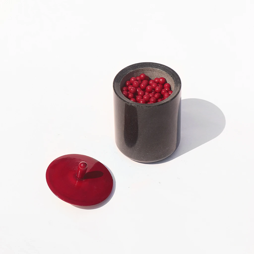 A container of black marble for all your dry keeps, think candies and savouries, with a red spin top as a lid in the craft of Channapatna.