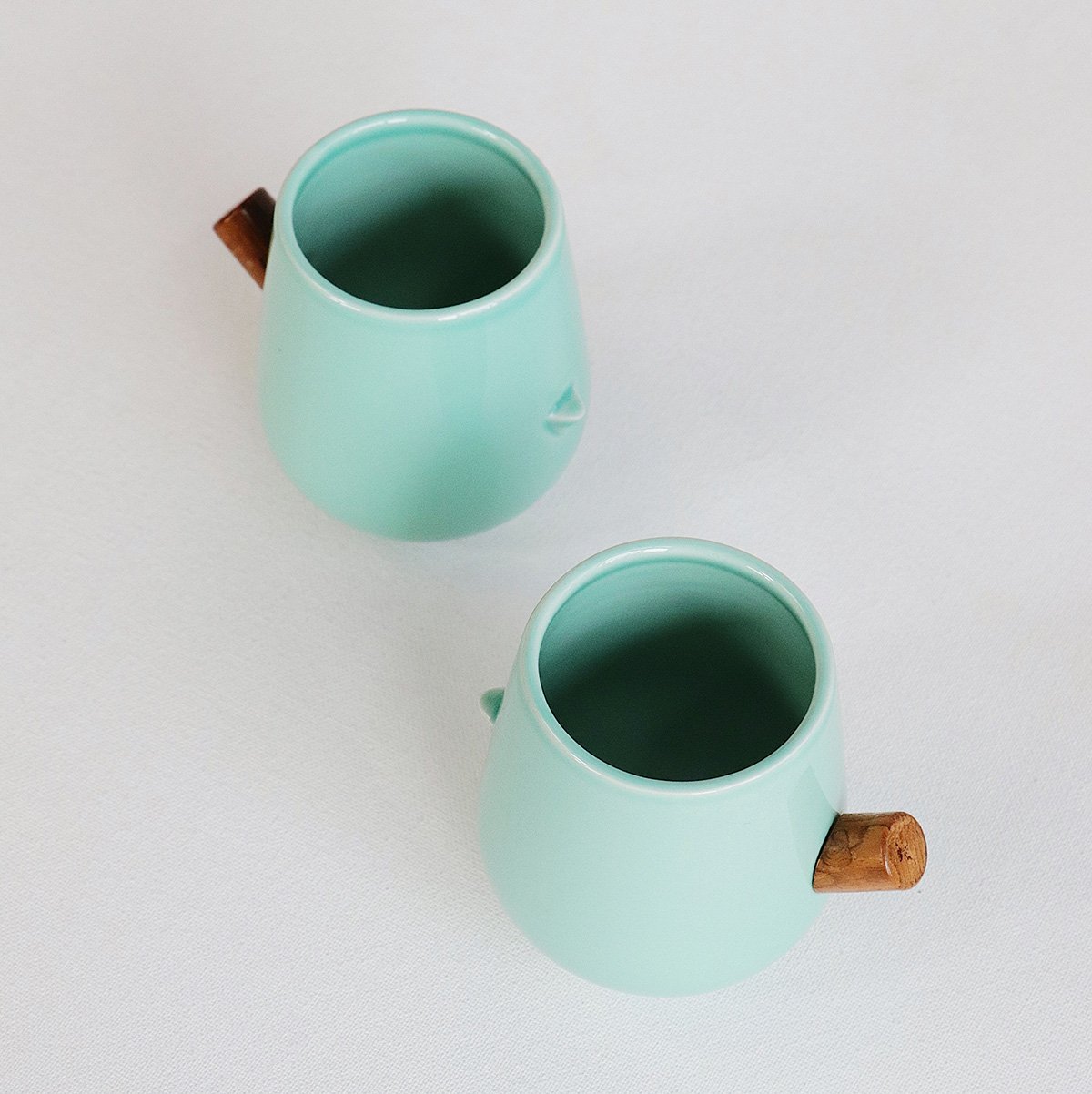 Set of two 370 ml turquoise ceramic glasses (85 mm dia x 95 mm ht), featuring a glossy finish and natural wood handle. Ideal for casual gatherings and everyday use.