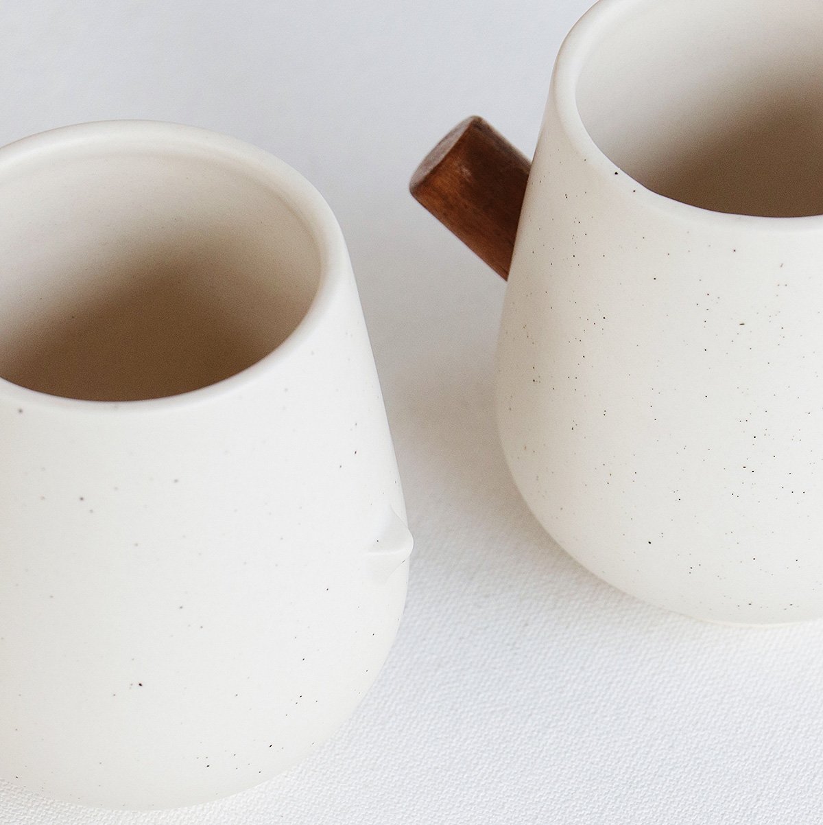 Set of two 370 ml white ceramic glasses (85 mm dia x 95 mm ht), featuring a matte finish and natural wood handle. Ideal for casual gatherings and everyday use.