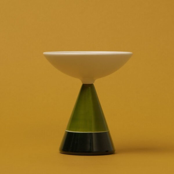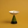 A small oil lamp with a ceramic body and Channapatna base in colour blocks of green